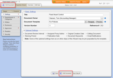 - If you currently have the document open and have the Properties Wizard, Overview, or Edit Questionnaire tab selected, click the Edit Document tab near the upper left corner or the Edit Document button at the bottom of the currently displayed Properties Wizard step.
