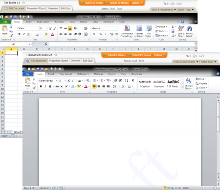 Writing a Word or Excel document within PolicyTech™ is much the same as writing a document in the Word or Excel program outside of PolicyTech. For example, while using Word or Excel inside of PolicyTech, you will see any customizations you have made to the Quick Access Toolbar and Ribbon while using Word or Excel outside of PolicyTech. Some of the differences you might notice when using Word or Excel inside of PolicyTech include the following: