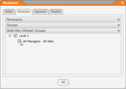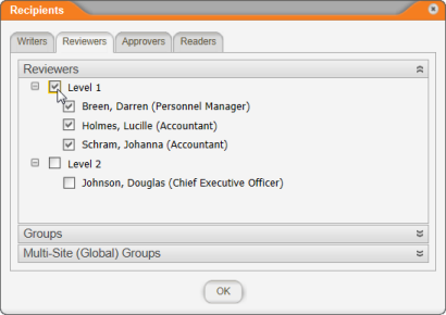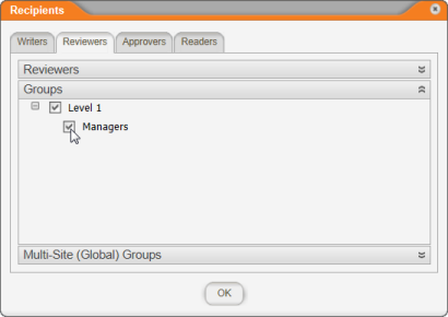 - To select writers, reviewers, or approvers as note recipients, click the Writers, Reviewers, or Approvers tab, and then do any of the following: