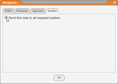 - To select readers as note recipients, click the Readers tab, and then click Send this note to all required readers.
