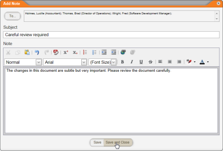 When assigning writers, reviewers, approvers, and readers in the Properties Wizard, you can include a note with instructions or other information concerning the writing, reviewing, approving, or reading of the document. Any note you write is included in the task notification email sent to assignees as soon as the document moves to the stage for which the note was written. For example, if you include a note while working on step 4. Reviewers, that note will be sent as soon as the document goes to review. An assignee can also access a note from within the document (see Reviewing Notes for details).