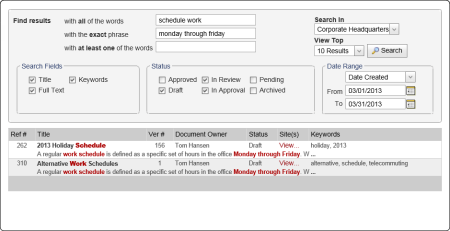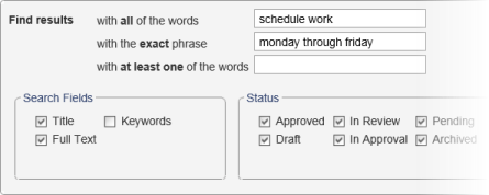 If you type text in more than one box, then all of the text must be found within the selected document areas in order for a document to be found. In the Advanced Search form below, for example, for a document to be found by this search, its title and contents combined must contain both of the words schedule and work plus the exact phrase "monday through friday."