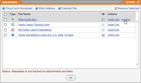 When you attach an external file, PolicyTechâ„¢ only uploads a copy of that file into the PolicyTech database. You cannot be sure that a user has read an attachment, because attachments are not tracked. If you want to control and track an external file, you will first need to convert it into a PolicyTech document.