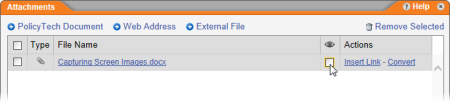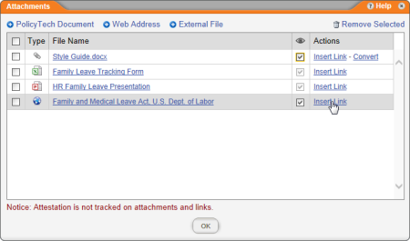 Important: PolicyTech requires that you convert the uploaded copy of the external file into a PolicyTech document before inserting a link to it. This helps ensure that the attachment is tracked and kept up to date. For example, if someone updates the converted attachment in PolicyTech, the owners of any documents containing a link to the converted document receive notification to update this link.