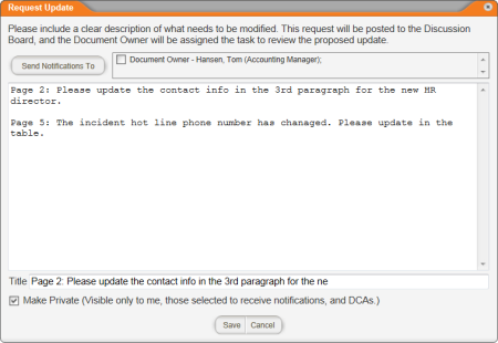 - (Optional) By default, your request is seen only by the document owner and any users you select. If you want all users who have access to this document to see the update request, deselect the Make Private option.