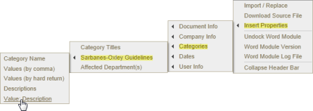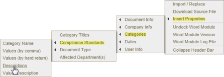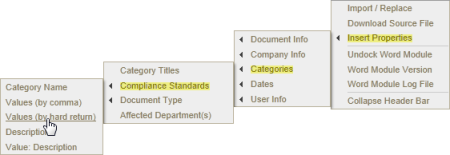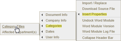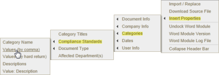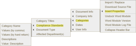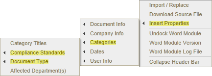 Location on Insert Properties menu: When a document creator assigns a category to a document, that category name appears on the Categories submenu of Insert Properties. The image below shows a Categories submenu of a document assigned to the Compliance Standards and Document Type categories.