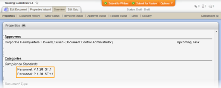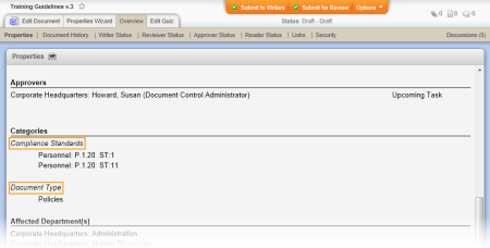 Location on Insert Properties menu: The image below shows the Category Name option on the assigned category submenu called Compliance Standards. The categories defined for any given company and the categories assigned to any given document will vary, so the category names you see will most likely be different than the ones in the image below.