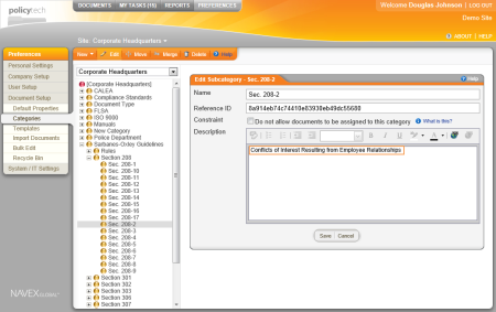 A value is the lowest-level assignable subcategory in a category hierarchy. In the image below, Sarbanes-Oxley Guidelines is the top-level parent category, Section 208 is a next-level subcategory, and Sec. 208-2 is a lowest-level subcategory, or value. A description can be entered for each category and subcategory.