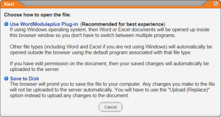 Note: If you see the Alert window below after you click the file name, go to Enabling WordModulePlus.