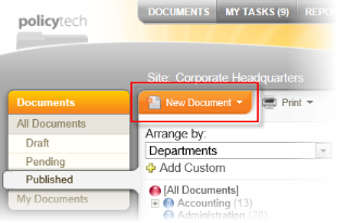 - Click DOCUMENTS. If you are a document owner, you will see the New Document option, as shown below.