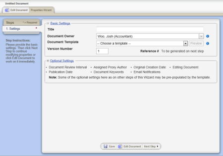 Important: You must at least type a title, choose a template, and then save the document before you can see the remaining Properties Wizard steps and edit the document.