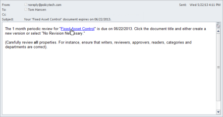 When you, as a document owner, create a document, you have the opportunity to indicate how often you want to be reminded to review the document and see if it needs updating (see Step 1: Settings). If you set a periodic review date, either relative to the approval date or on a specific date, you'll receive a task notification email and a task in MY TASKS as the review due date approaches.
