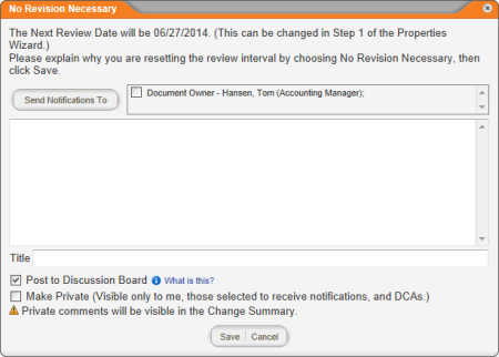 A discussion window appears for you to explain why you are resetting the review interval without making changes. Complete the discussion form (see Working with Document Discussions for details), click Save, and then click OK.