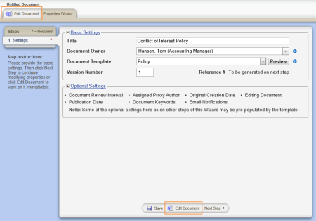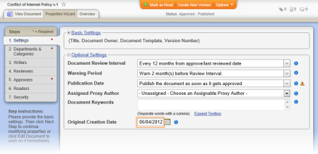 Source: Original Creation Date is an optional setting in the Properties Wizard and is useful for adding information to imported documents. The creation date for an imported document is set on the day it is imported, while the document was most likely created outside of the PolicyTechâ„¢ setting at an earlier date. After the document has been imported, the document owner or document control administrator can indicate when the document was originally created. (Properties Wizard > 1. Settings > Optional Settings > Original Creation Date)
