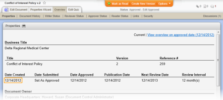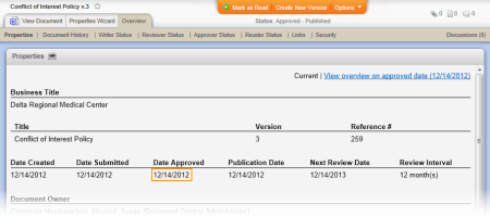 Where to view: The approval date you insert will be the same as the one displayed in the document overview. (Overview > Properties)