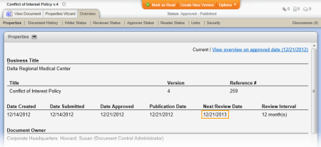 When it changes: The next periodic review date of a published document is reset only if the document owner or document control administrator change the review interval in the Properties Wizard (Properties Wizard > 1. Settings > Optional Settings > Document Review Interval) or by selecting No Revision Necessary (Options > No Revision Necessary).