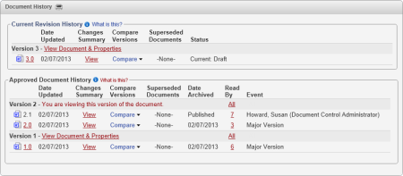 The Document History page can contain two areas: the Current Revision History and the Approved Document History. You will see the Current Revision History if a version of the document is being created or revised and is in the draft, collaboration, review, or approval status. The Approved Revision History appears if one or more versions of the document have been approved.