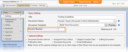 Source: PolicyTech™ auto-generates the version number. The document creator can enter a different version number when the document is first created (first version). (Properties Wizard > 1. Settings > Basic Settings > Version Number)