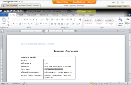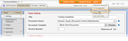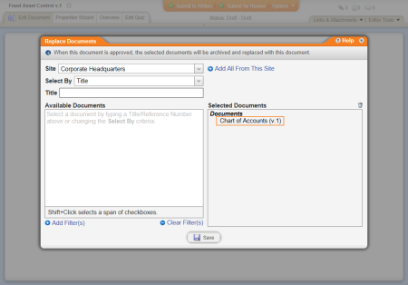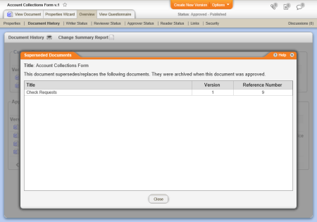 Source: When the document owner creates a new version of a document, the previous version is automatically superseded. The document owner can also select other documents to supersede. (Options > Replace Documents)