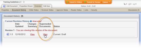 Where to view: The list of superseded documents you insert will be the same as the one displayed in the document overview. (Overview > Document History > View (in Superseded Documents column))