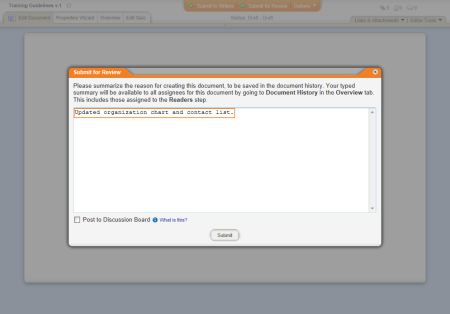 Source: When a document owner creates a new version of a document and then submits it for review or approval, he or she has a chance to specify the changes made in the new version. If the document owner does not specify changes, the text "New Version" appears by default. (Properties Wizard > 2. Departments & Categories > Departments)