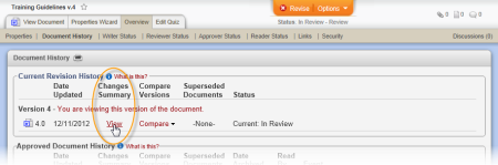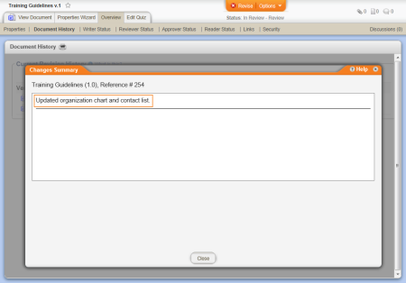Where to view: The version change summary you insert will be the same as the one displayed in the document overview. (Overview > Document History > View (in Changes Summary column))