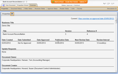 A document's overview provides quick views of a document's properties, history, assigned task status, links, and security settings.