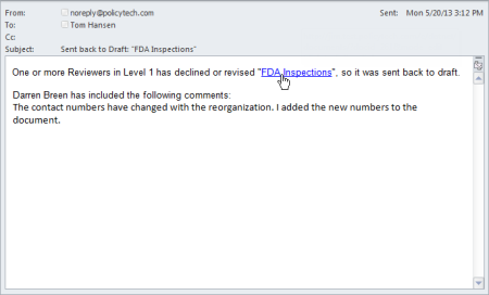 - Open the notification email, read the comments made by the reviewer or approver, and then click the document link.