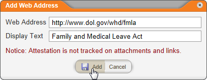 - In the Add Web Address window, type or copy and paste the web address, type the text you want displayed as the link in the document, and then click Add.
