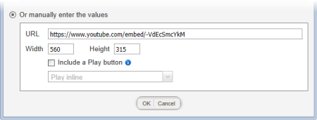 - To format the video frame yourself, click Or manually enter the values. In the URL box, type or paste the video URL, including the protocol (http:// or https://), and then set the frame size by typing a width and height in pixels.