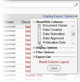 To add one or more dates to the printed document list, click Display/Export Options, click Show/Hide Columns, and then select one or more of the date columns listed above.