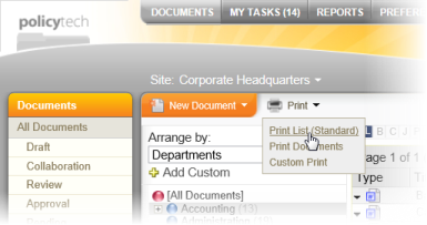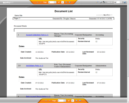 You can print or save to disk a list of the documents displayed in the main document list, such as all the published documents from the accounting department. Each document entry always contains at least the following information: