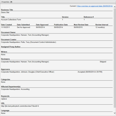 All of this information is for the document in its current state. You can also view the properties on the date when the document was approved. In the example below, the user would click View overview on approved date (02/18/2012). There may be differences between the two Properties pages, because document control administrators and the document owner can change document properties within the approved document. A document control administrator can also change PolicyTechâ„¢ preferences that may affect document properties.