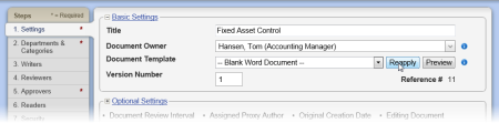 Note: A document control administrator (DCA) can change or reapply a template's properties (not contents, headers, or footers) to documents in pending or published status or to multiple documents at once using Bulk Editor.