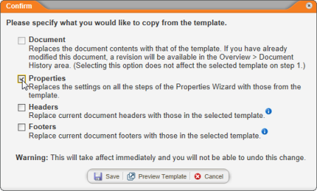 1. (Optional) To see the template's document contents and properties, click Preview Template to open the previewer in a separate window. Click View Document to see contents; click Overview to see properties. When you're finished, close the preview window.