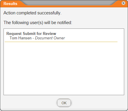 Note: Requesting submission for review sends an email notification to the document owner, but it does not add a task to My Tasks. You can add a document owner task in the Settings step of the Properties Wizard (see "Step 1: Settings," step 4).