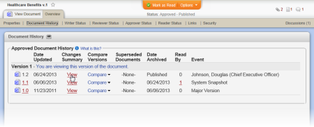 - Click Overview, click Document History, and then, in the Changes Summary column, click View.
