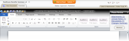 You can access most of these items using the Please Review pop-up menu. If a document contains an attachment, note, discussion, or change summary, the Please Review pop-up menu is displayed when you open the document, as shown in the screenshot below.