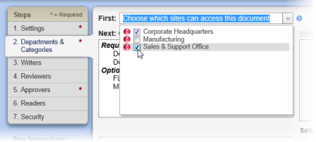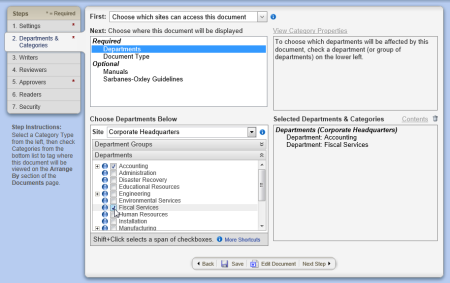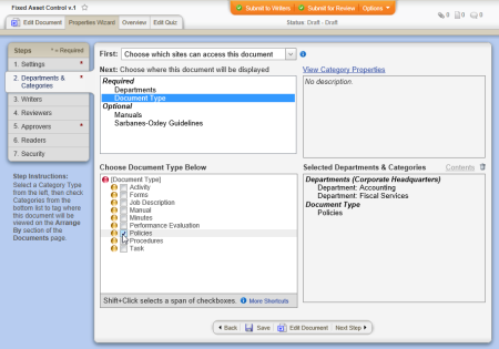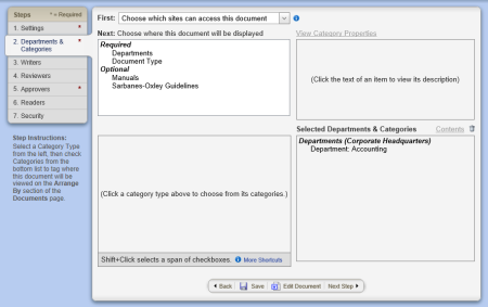 An important part of document creation is determining who should interact with the document you're creating. In this step of the Properties Wizard, you indicate which sites and departments should have access to the document and in which categories the document belongs.