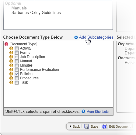 - The category creator has the option of allowing document owners to create new subcategories. If the current category allows new subcategories, Add Subcategories appears above the category list box, as shown below. See Adding a Subcategory if you need to add a subcategory.