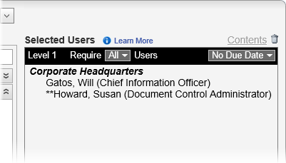 - (Optional) Set a due date for when all approvers should be finished with the document. For details on the different ways to set a due date, see Setting Due Dates for Writing, Reviewing, Approving, and Reading Tasks in the "Working with Levels" topic. (You can specify a different due date for each level.)