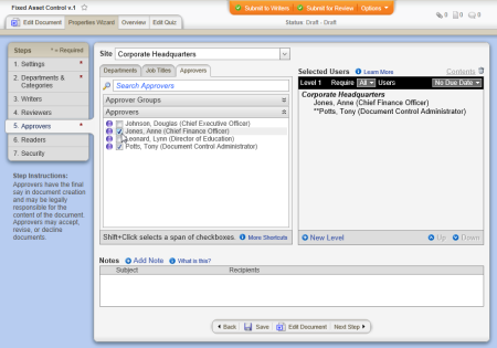 - A list of approvers within the selected site is displayed by default. If you want to use another method for selecting approvers, see Other Ways to Select Approvers. Otherwise, select one or more reviewers.