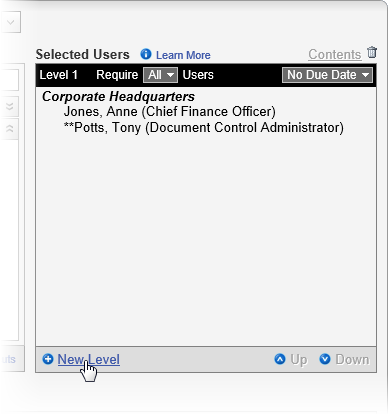 - (Optional) As you assign approvers, they are all assigned to level 1 of the approval stage, meaning that they will all receive a task at the same time when the document goes to approval. If you want the document to go to approvers in a specific order, click New Level to create additional approval levels. You can then specify how many of the assigned approvers within a level must finish their reviews before the document moves on to the next level. You can also specify a due date for each level. See Working with Levels for details.