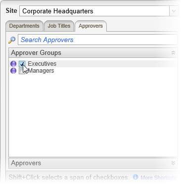 Click the Departments tab, click a department, and then select one or more listed approvers.