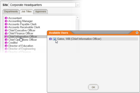 Click the Job Titles tab, click a job title, and then select one or more listed approvers.