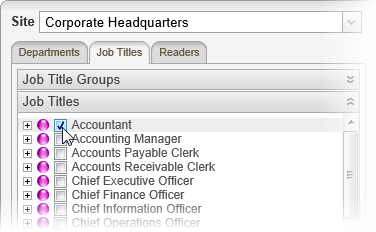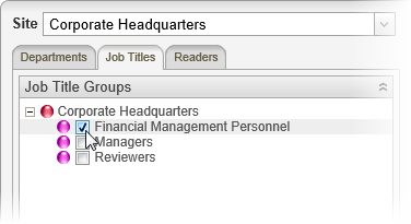 When you select a job title, all users assigned that job title will be added as required readers. Click the Job Titles tab, click the Job Titles heading, and then select one or more job titles.