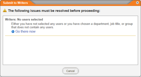 Note: If no writers have been assigned to the document, you will see a window like the one below. Click Go there now, assign one or more writers, and then click Submit to Writers again.