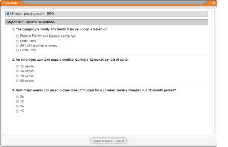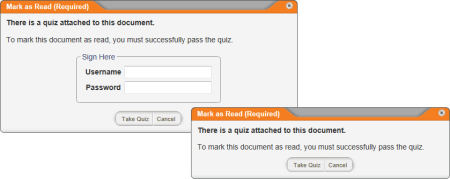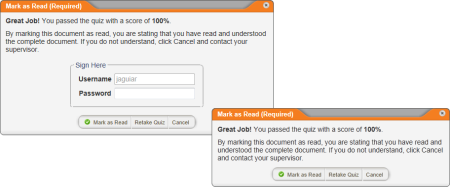 If the current document includes a questionnaire, you will see one of the following windows when you click Mark as Read. You must successfully complete the questionnaire before you can finish marking the document as read.