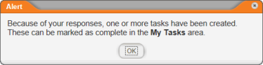 - (Conditional) If the questionnaire creator associated a task with one or more of the answers you selected, you will see the following alert. Click OK to clear the alert. You can find the new task in the Questionnaire Tasks area in the MY TASKS list (see Working with My Tasks).