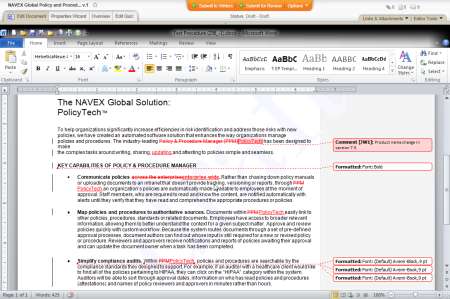 PolicyTechâ„¢ turns on Track Changes whenever a reviewer or approver chooses to revise a Word document. Track Changes marks all text changes, including insertions, deletions, moved text, and formatting changes. Reviewers and approvers can also insert comments to explain marked up text or to identify other changes that need to be made.